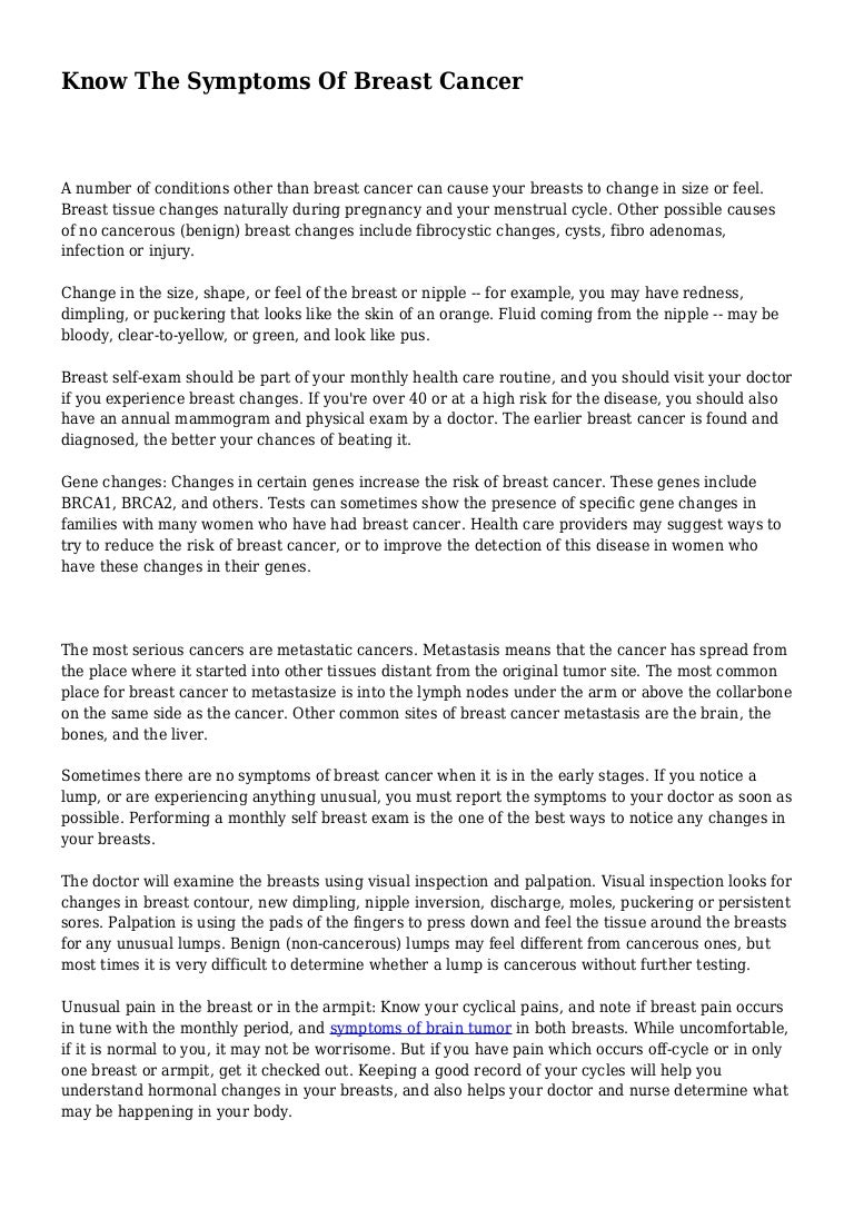 In other cases, however, the first sign of breast cancer is a new lump or mass in the breast that you or your doctor can feel. There was no pain & she felt ok one morning she woke up with sore arm and unable to lift it up. This may be because cancer cells use up much of the body's energy supply. However, the professionals at stony brook cancer center's carol m. This doesn't mean he or she is concerned that the breast change could be cancer. These stages are used to reflect how far the cancer has progressed. Minkin mentioned earlier, hormonal changes during your menstrual cycle could also be to blame. There was a swelling in armpit only & she though she had hurt herself. The specific signs and symptoms a person may have with metastatic breast cancer can vary significantly from one person to another. Lumps and bumps on your breast tissue are signs that cancer might be growing. The issue—which is called peau d' orange, due to its resemblance of the texture of an orange peel—could be a sign of a more invasive type of breast cancer. Rather, it's an extra precaution to make sure the area stays the same, and this often eases patients' minds. Breast cancer that has moved into a lung may cause: